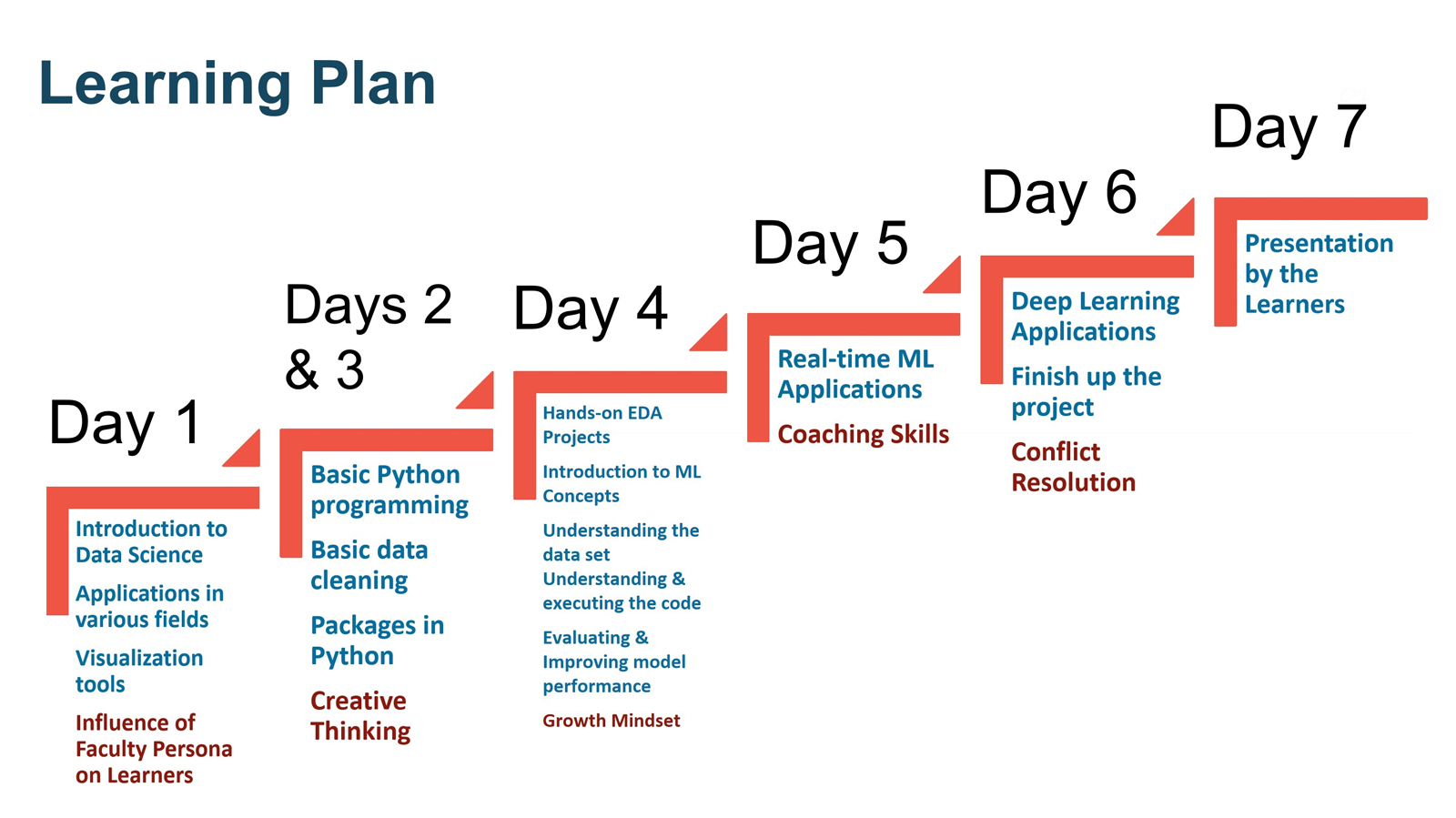 The week-long Future Skills Bootcamp on Data Science and Soft Skills, organized by the upGrad Foundation and conducted at NSTI centers in India, is designed to shed light on new, tried and tested, result-driven and impact-based Data Science concepts added with contemporary soft skills to enhance the existing skillset of learners and train them in the basics of Data Science and its delivery. This program endeavors to spread knowledge in an effective and interesting manner to the trainers by using practical methods. It will be offered preferably, but not limited to, women instructors.