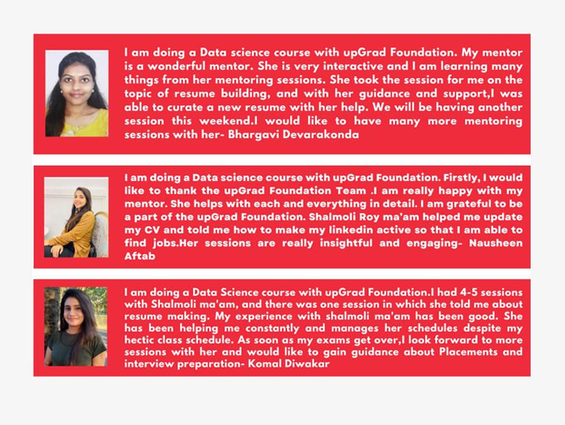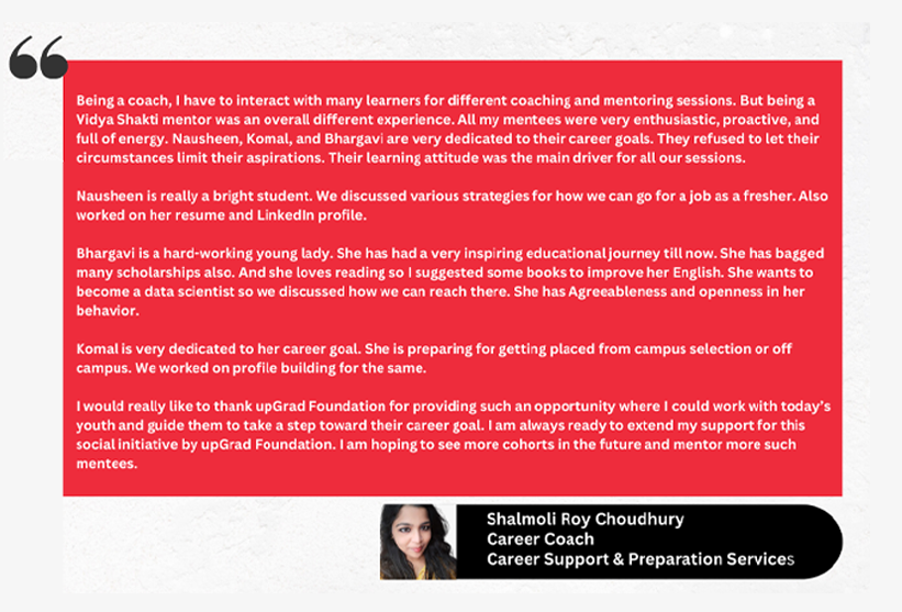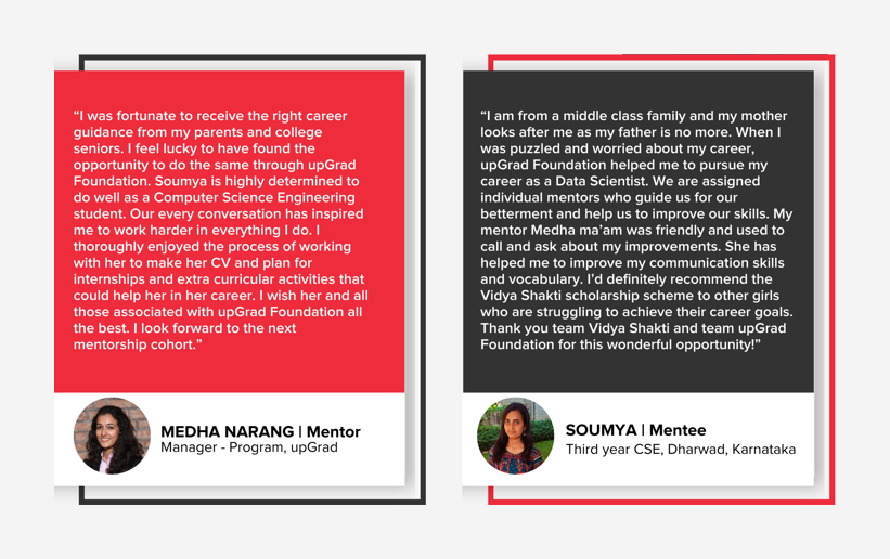 The other two challenges can be solved through Mentoring support. In this virtual program, upGrad employees (mentors) will help close the network and information gap which is vital for young women who lack career pathways through their immediate family or extended networks. It will also help improve the restrictive gender norms by providing the correct information and new perspectives to Vidya Shakti Scholars (mentees).